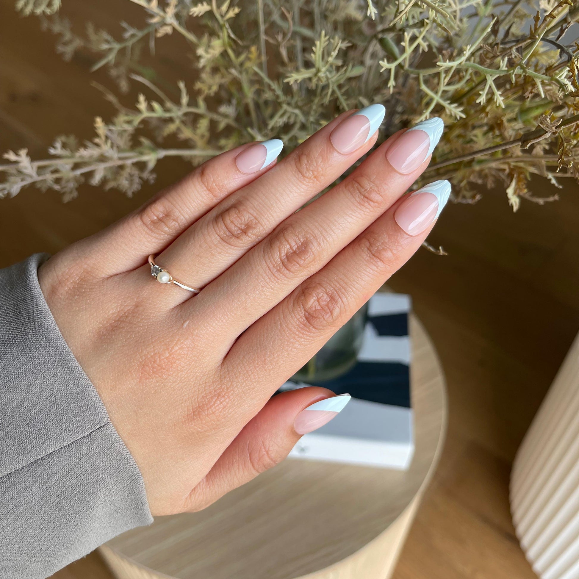 When you want a poetic, airy look, Dewy Ribbon is the one. Medium almond press-on nails with delicate linear accents that feel like morning dew.